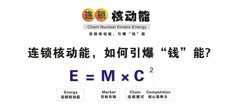 • 廣州采納企業(yè)管理顧問有限公司陳宏創(chuàng)建的連鎖核動(dòng)能理論 以愛因斯坦的能量公式為基礎(chǔ)創(chuàng)建,其理論意義是: 企業(yè)找準(zhǔn)了目標(biāo)市場,以連鎖的方式經(jīng)營,核心競爭力越大, 推動(dòng)其發(fā)展能量就越大。